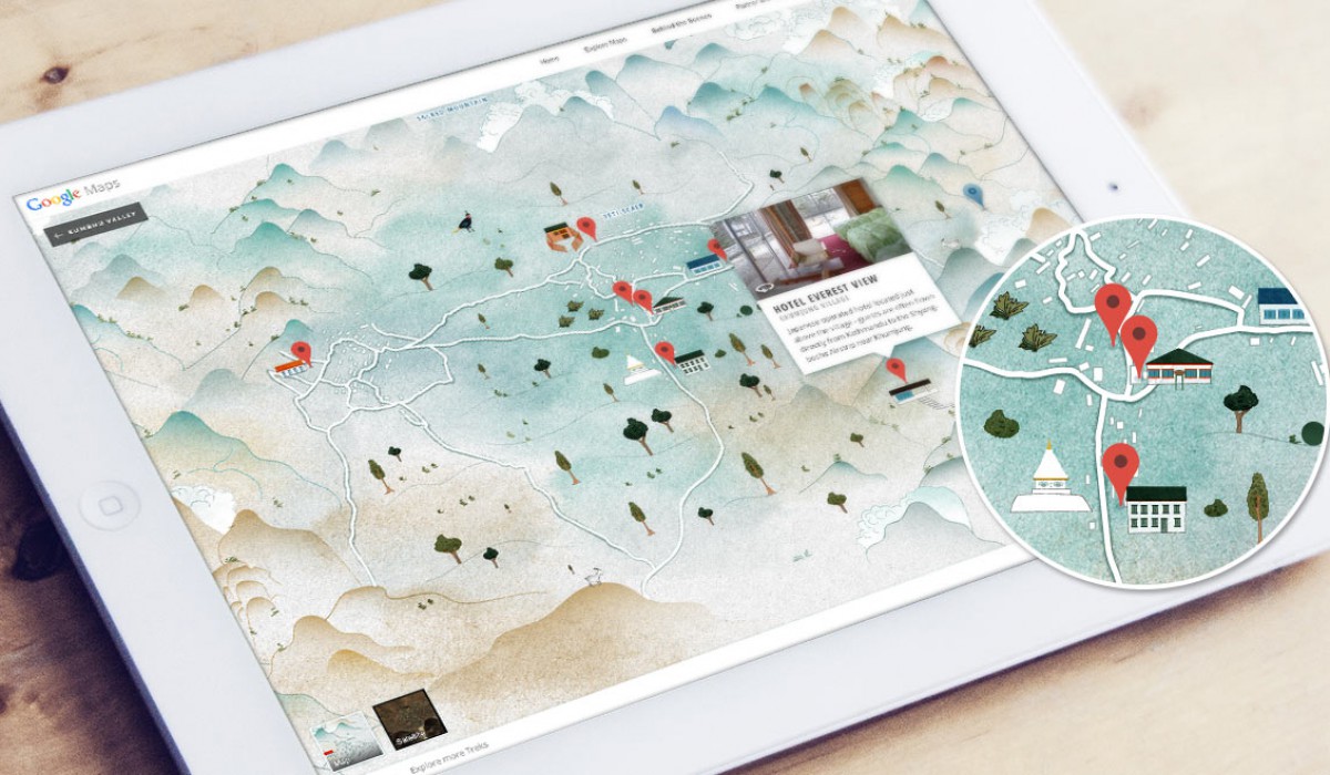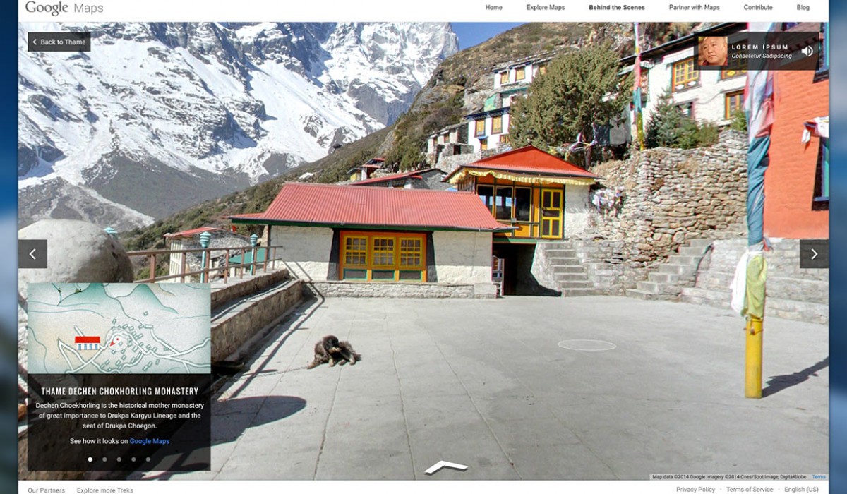 In the shadow of Mt. Everest lies a group of sacred valleys known as the Khumbu. For centuries this remote mountainous region has been the homeland of the Sherpa people. The Google Street View imagery takes armchair travelers around the region and communities at the base of the mountain, such as the Phortse, Khumjung, Thame, Lukla, and the Namche Bazaar. My role: concept, design