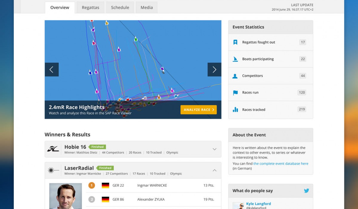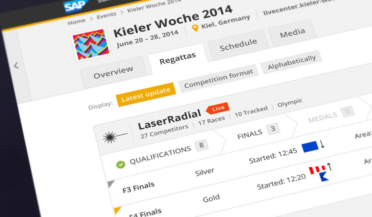 The SAP Sailing Analytics website has been developed to provide sailors and fans with the latest in-depth information on sailing races and events. The goal is to measure, analyze and improve performance in practice and competition, and to provide subsequent statistical comparisons of boat speed, maneuvers, strategy and tactics. My role: concept, design