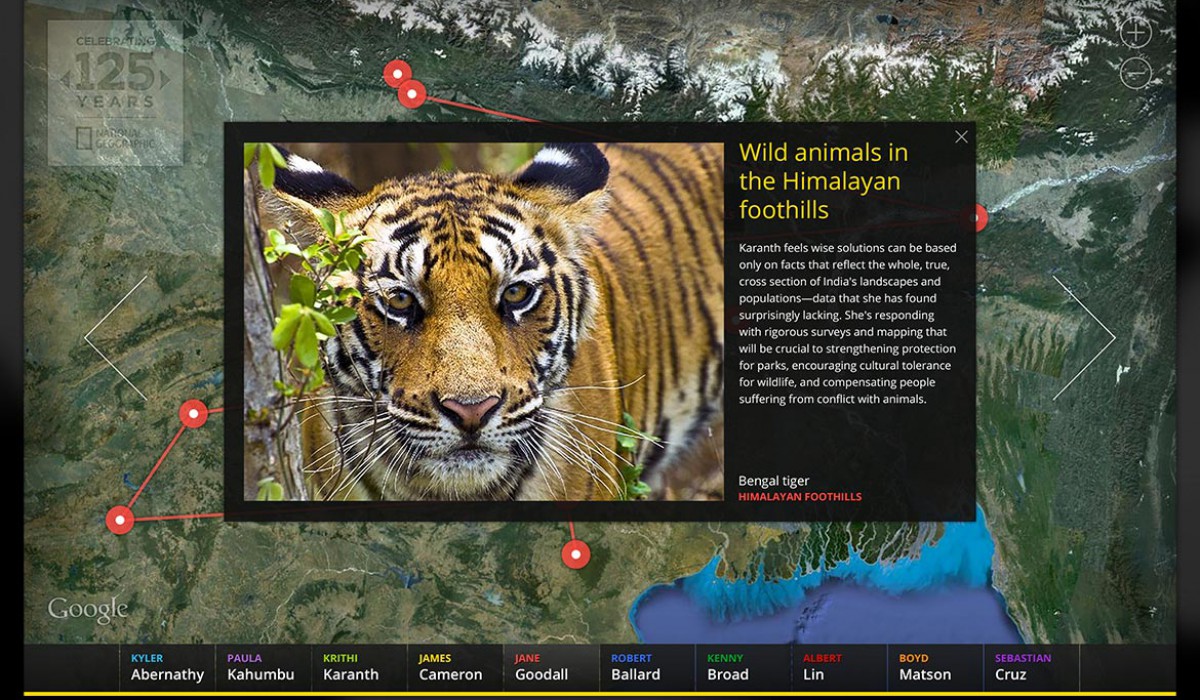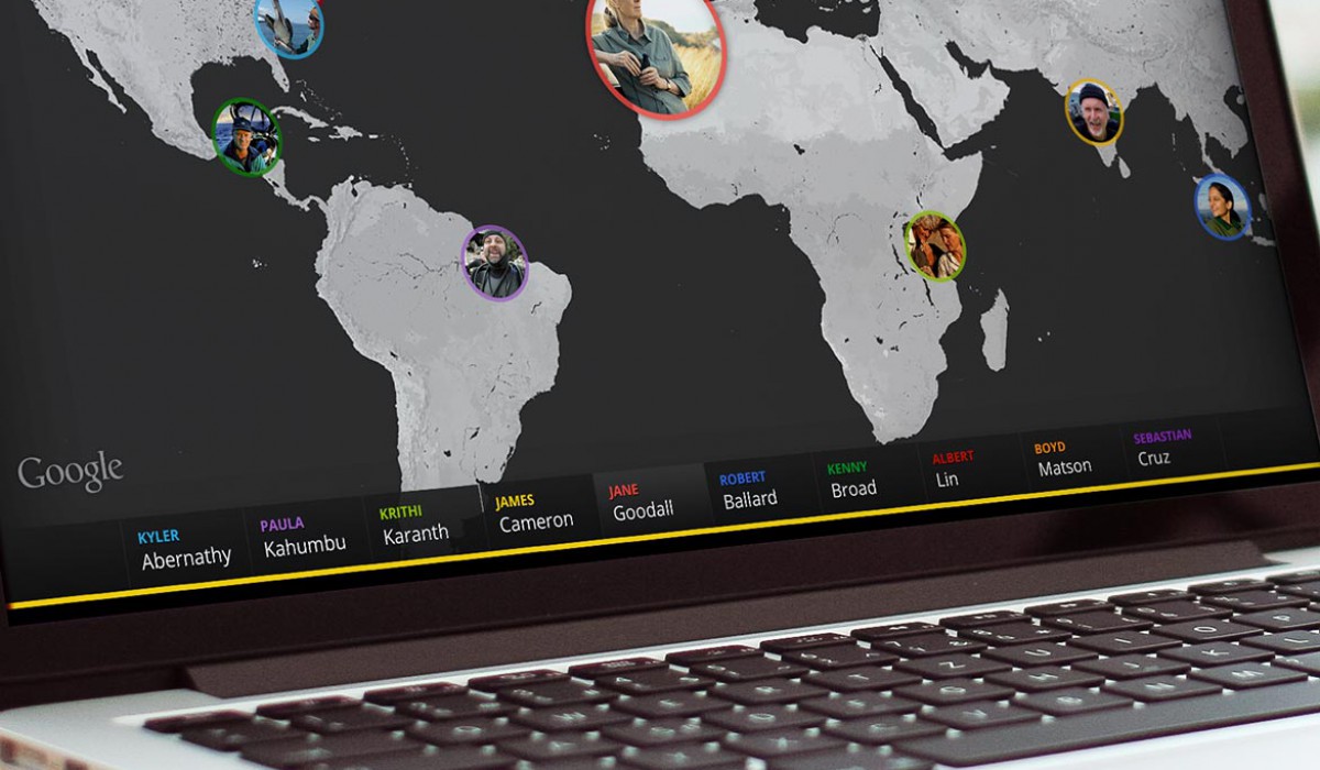National Geographic Society’s 125th anniversary was celebrated in January 2013. At this occasion prominent researchers were invited to participate in a global video conference with fans and readers of the magazine on Google+ Hangout. Google commissioned us to design an application that would display the life of the eight celebrities and enable visitors to explore their world and work. My role: concept, design